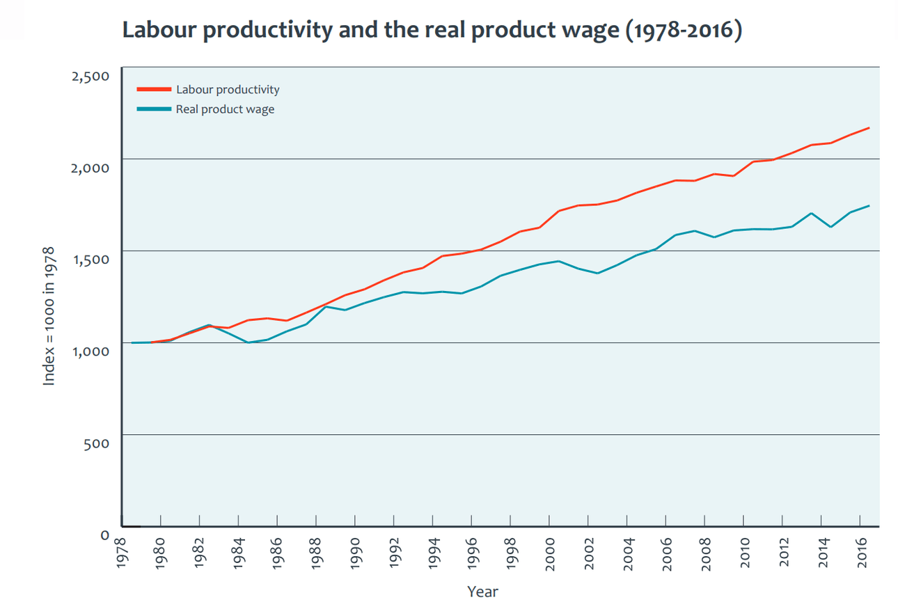 Since the 1970s, employers have enjoyed significantly increased output from their employees, but workers haven’t seen the same benefit. Labour productivity more than doubled from 1978 to 2016, while real wages have risen considerably more slowly.