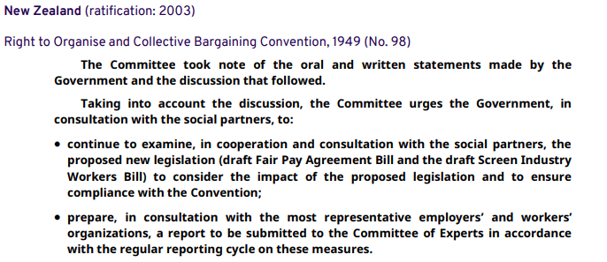BusinessNZ had convinced the ILO to examine New Zealand’s FPA bill at their meeting. The ILO looked at the bill, and published this: