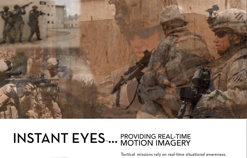“Instant Eyes”, the product of a partnership with US defence contractor L2 Aerospace, was an unmanned aerial vehicle launched from a hand-held rocket that provided high-resolution imagery to its users on the ground.