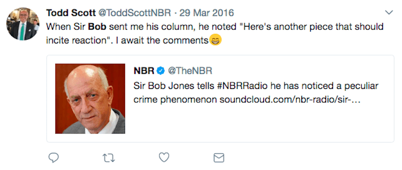 Next came the departure of columnist and property magnate Sir Bob Jones in February after he (satirically, he says) called for a Māori Gratitude Day. Scott dubbed it “inappropriate content” and called for an end to opinions masquerading as news, and found time to debut a novel method of communicating new newsroom policy to staff: a public tweet.