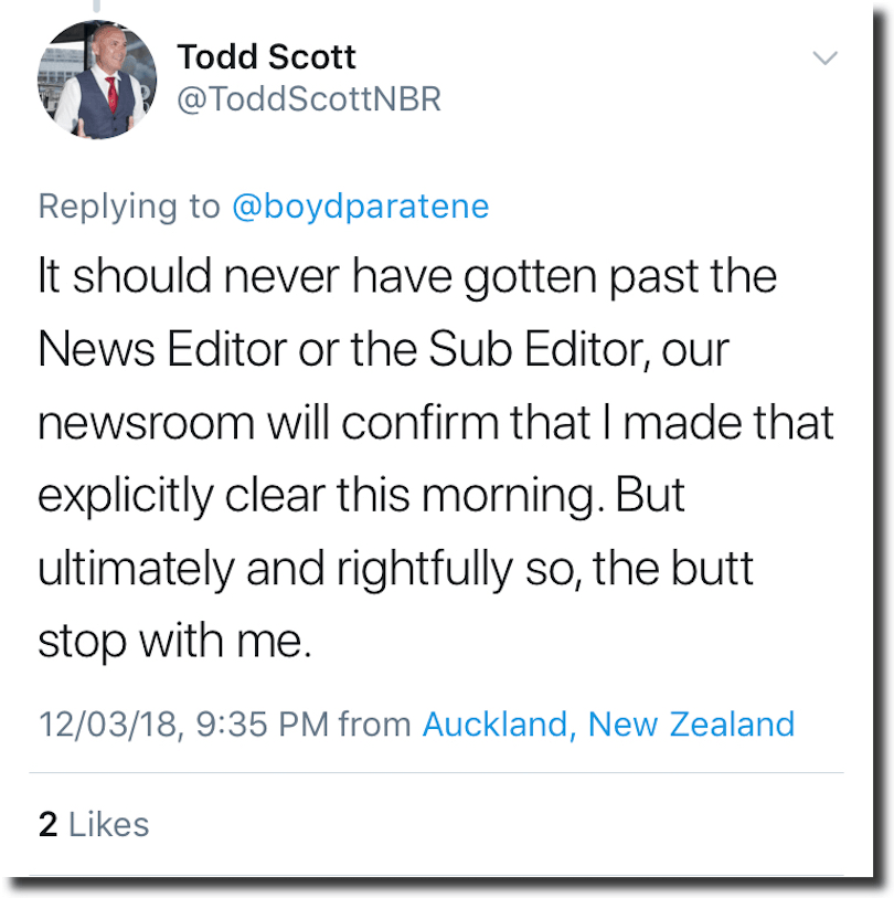 Businessdesk’s owner, highly respected journalist Pattrick Smellie, has stayed mostly quiet on the breakup. It was only when Scott tweeted out of the blue on April 22, about the “appalling puff piece”, that Smellie replied. “Of the many thousands of BusinessDesk stories that NBR ran over 6 years, this is only one that I regret us publishing,” he wrote. “You might be gracious enough to acknowledge that I made a trip to Akld to front you personally on this one story.”