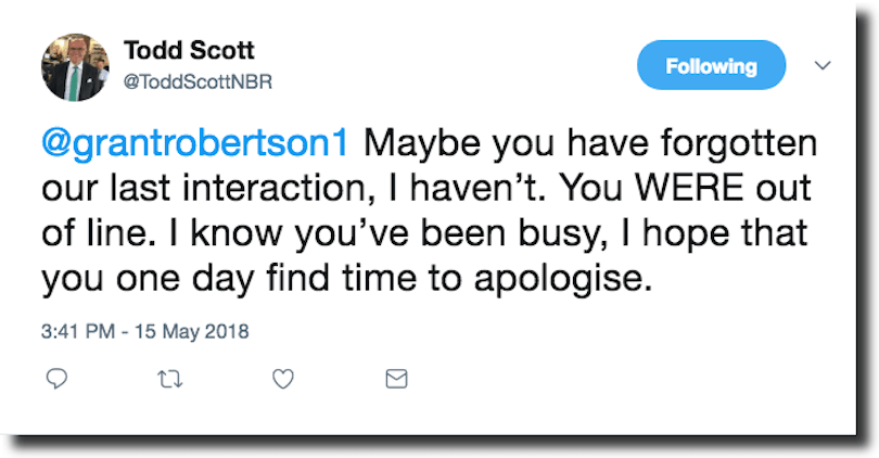 Todd Scott is a truculent tweeter, taking aim at ad agencies, lobbyists, other media and former columnist Matthew Hooton apparently at will, whenever inspiration strikes. His most recent Twitter salvo saw him cryptically demanding, on the eve of the Budget, an apology from finance minister Grant Robertson.