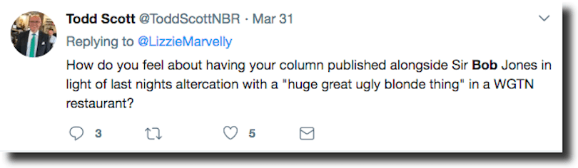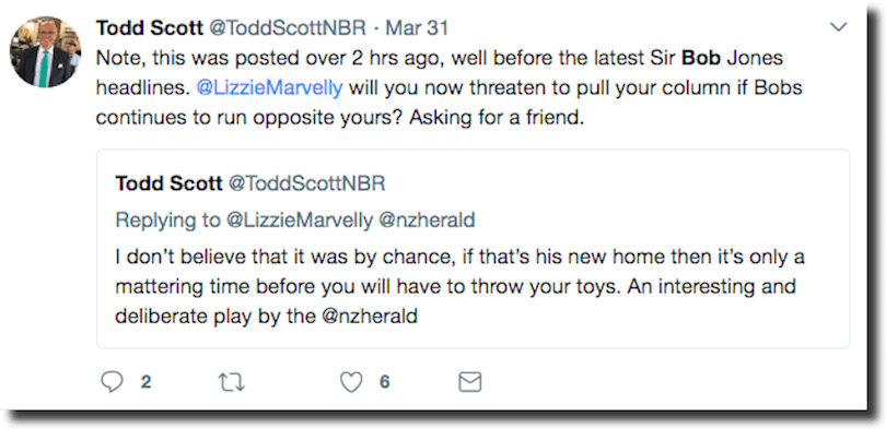 It’s hard to put all of his tweets into this context – some appear more like a personal vendetta. Herald columnist Lizzie Marvelly was the focus of one of Scott’s tweet-storms and complained Scott hounded her. She found a high-profile ally in business leader Sarah Trotman, who says Scott was “pestering” her on Twitter, too.