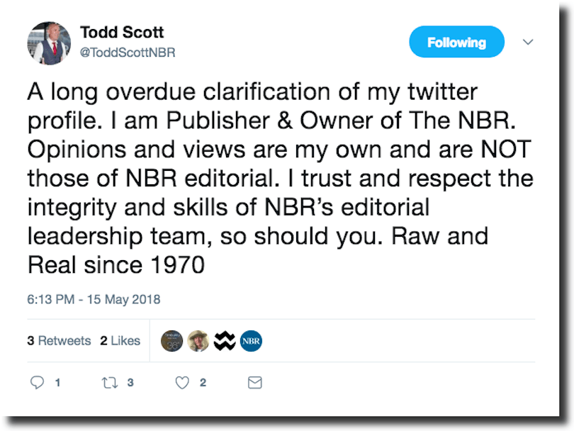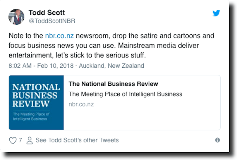 For NBR the overarching goal is not clicks, but subscribers. Given that, perhaps Scott’s Twitter activity is comparable to a newsagent touting goods. He routinely links his high profile antics to this sentiment during our interview. It’s all part, he says, of a sales pitch to an audience outside of those already reading NBR.
