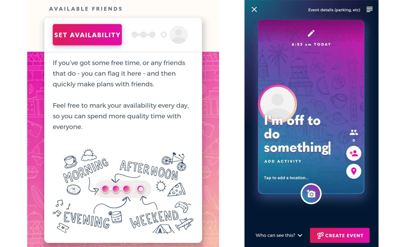 For users, the app works by curating a list of relevant events in the area and allowing you to share with friends what days and times you’re free to meet, while businesses are able to make events and invite people to attend, with the option of promoting ads onto users’ feeds – but only if they’re relevant to your interests, says Berns.