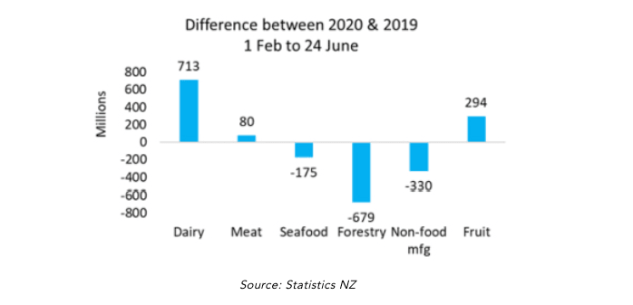 While forestry, seafood and manufacturing exports were knocked to the mat and still haven’t recovered, dairy, meat and horticulture are up a spirited $713m, $80m and $292m respectively.
