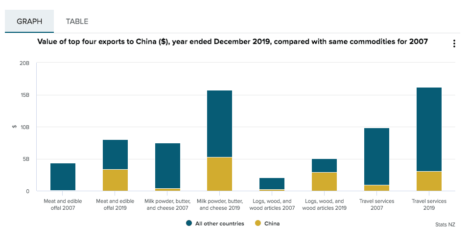 Since 2017, China has been New Zealand’s largest trading partner. In the year ending December 2019, 23% of New Zealand’s total goods and services exports and 16% of imports by value were with China.