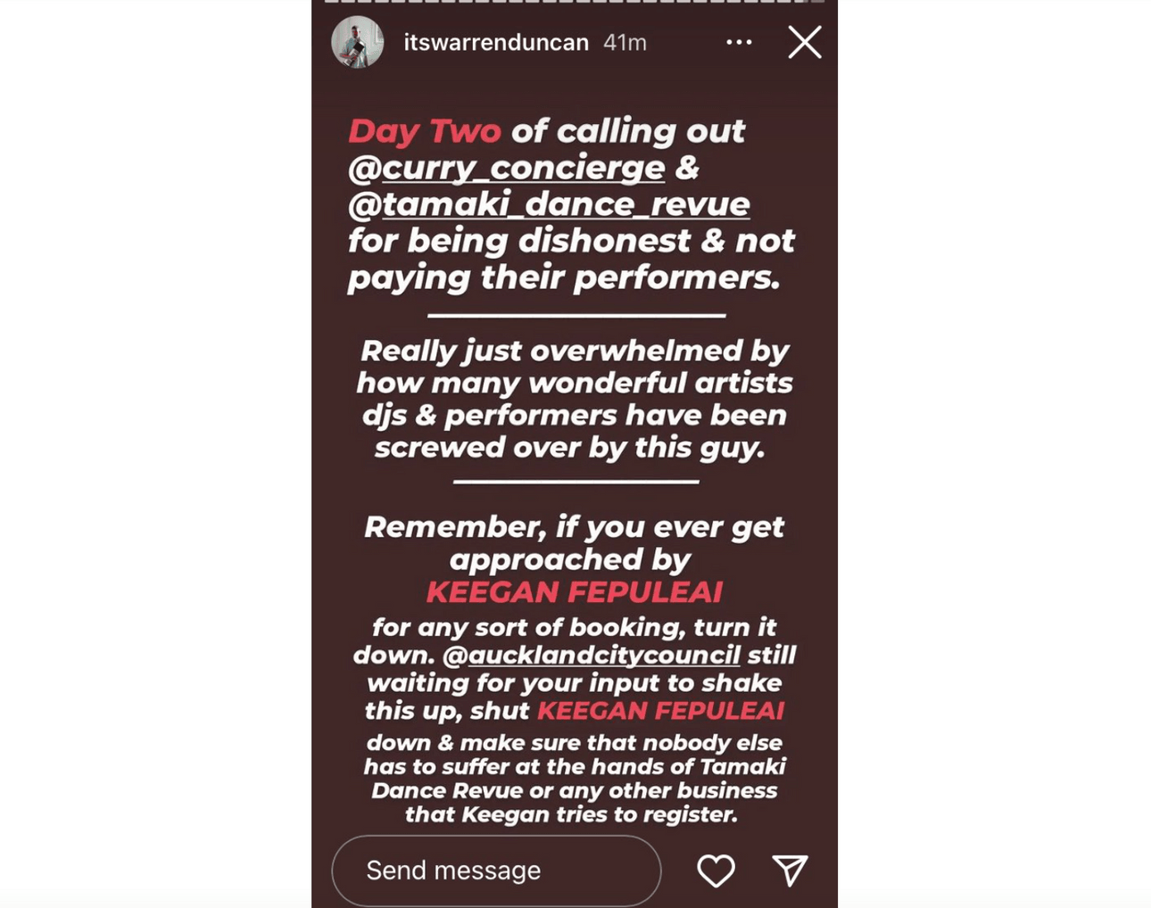 While on tour in Australia at the beginning of September, Duncan learned that others involved in the festival also hadn’t been paid. On September 4 he went public with his experience with Fepulea’i on Instagram. He says he felt compelled to speak up because “our industry is so small and I’m such an advocate for all of our DJs, musicians, performers – everyone deserves to get paid fairly and to get treated the right way”.