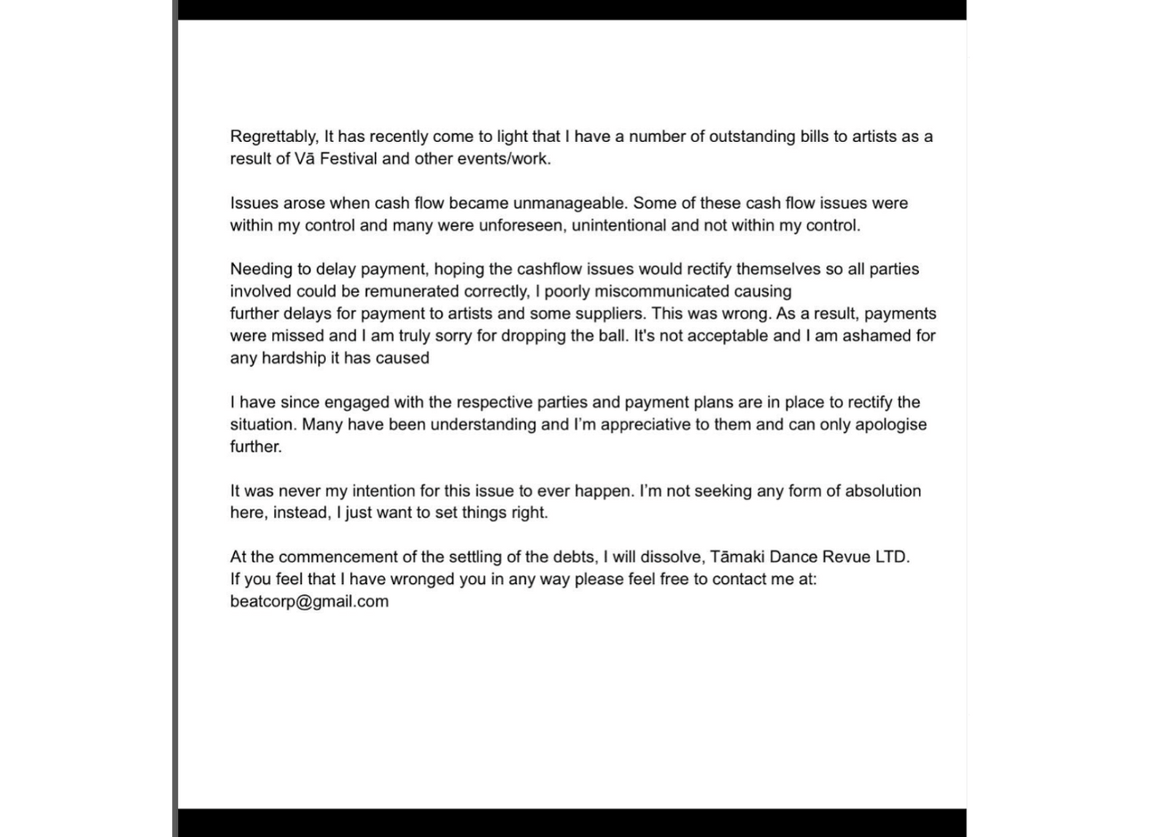 In his email, Fepulea’i said five artists and one supplier were yet to be paid for their work at Vā, for an amount he says is, “just shy of NZ$8,000”. By the end of the day, “that will be four artists and one supplier,” he wrote. “I have payment plans in place with all of these parties.”