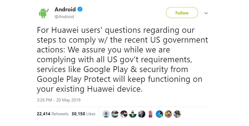 “Anybody who has a Huawei phone currently in the market, there’s no need to panic or rush back to retailers yet. There is no need to do anything like that because we’ve said we’ll continue to support the phones and Google have said the same.