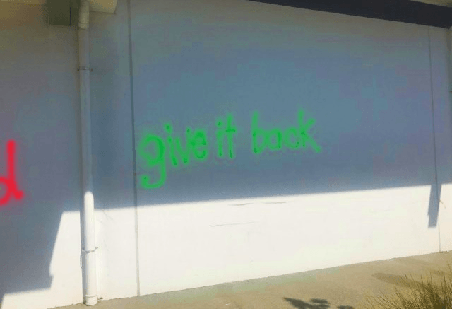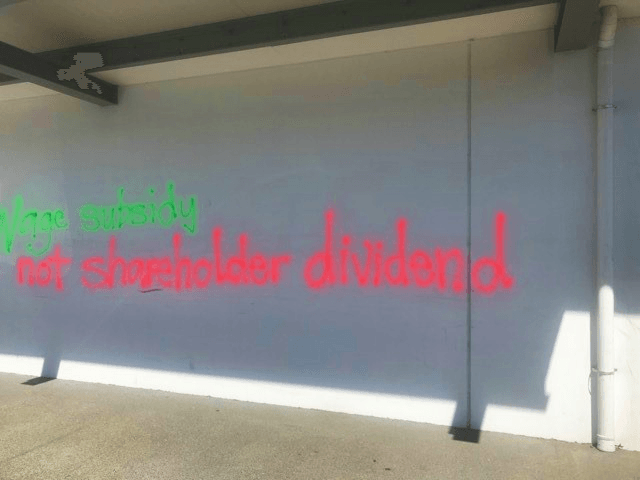He then rode across the carpark to the Briscoes, got off his bike, and, having never done anything like it before in his life, tagged on the outside wall in foot-high words: “Wage subsidy not shareholder dividend give it back.”