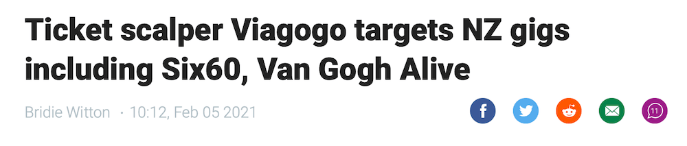 It’s not all bad news. The Commerce Commission has engaged Viagogo in court, and achieved results. Mitchell believes Viagogo’s reach and domination is diminishing. “I don’t think it’s as bad as it was a few years ago. There has been so much media coverage of their dodgy practices that most people are now aware that there’s a high chance you’d be buying a fraudulent ticket if you purchased it through Viagogo,” he says.