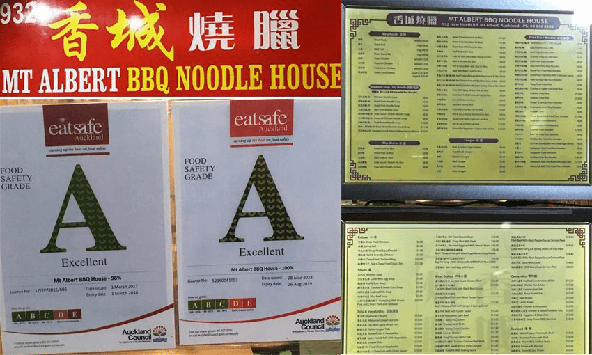He doesn’t muck around. “He’s a new owner. He copied my name, he copied my menu.” Huali points to the food grade certificate stuck to the post at his entrance, something I’ve seen him show almost every customer who walks into his restaurant. It says “Mt Albert BBQ Noodle House”. Then he points to the food grade certificate certificate next door, which says “Mt Albert BBQ House”.