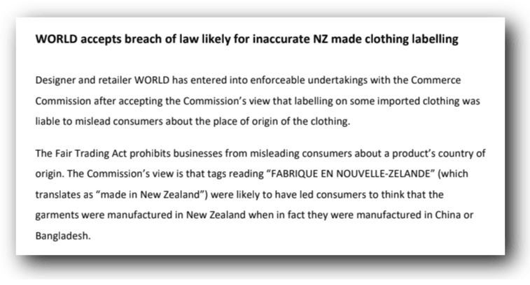 In essence, WORLD has undertaken to not put their “Fabrique en Nouvelle Zelande” tags on clothing manufactured overseas, but apparently escaped any greater sanction.