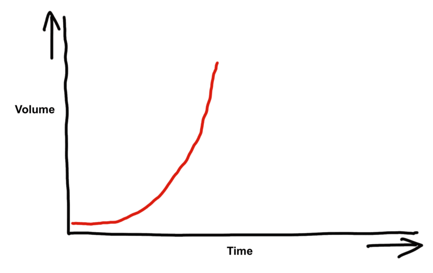 By definition, exponential growth is a doubling in absolute terms of whatever you are measuring, over a consistent and repeating period of time (the doubling time). While the graphs appear to grow like crazy, what many people don’t realise is that such growth comes from a consistent growth rate. It seems counterintuitive, but a consistent or static growth rate always results in exponential growth.