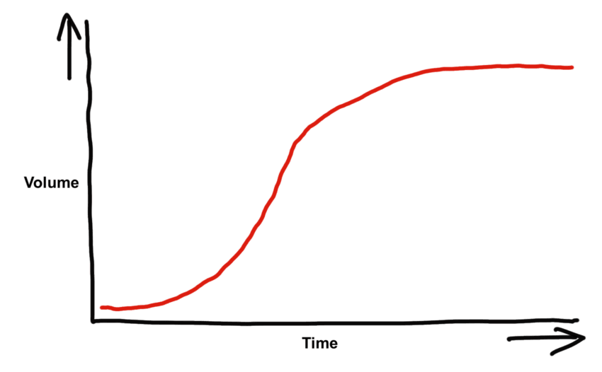 Now let’s consider the second point: exponential growth can’t go on forever. The laws of physics don’t allow it. If you carry on your graph for long enough the shape will always change after the exponential part.
