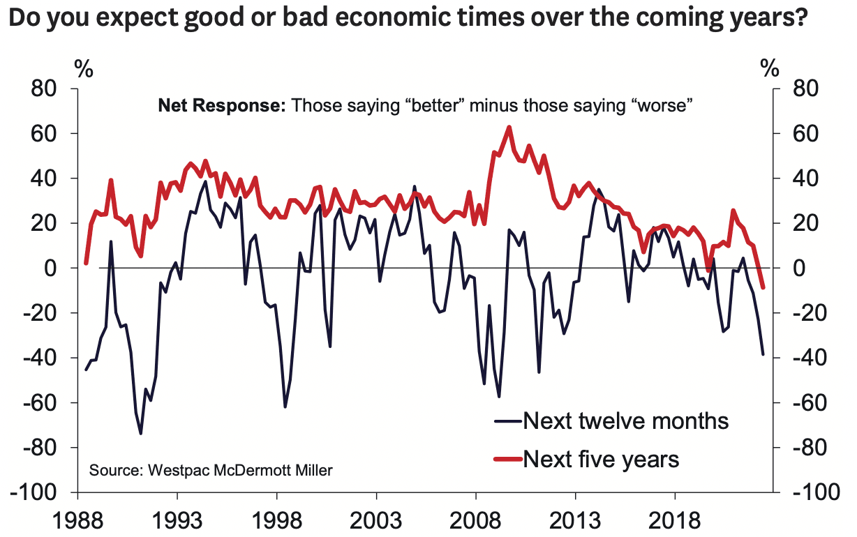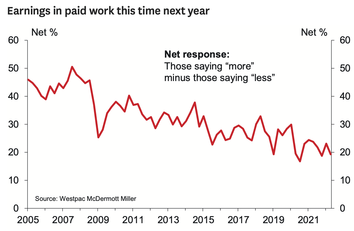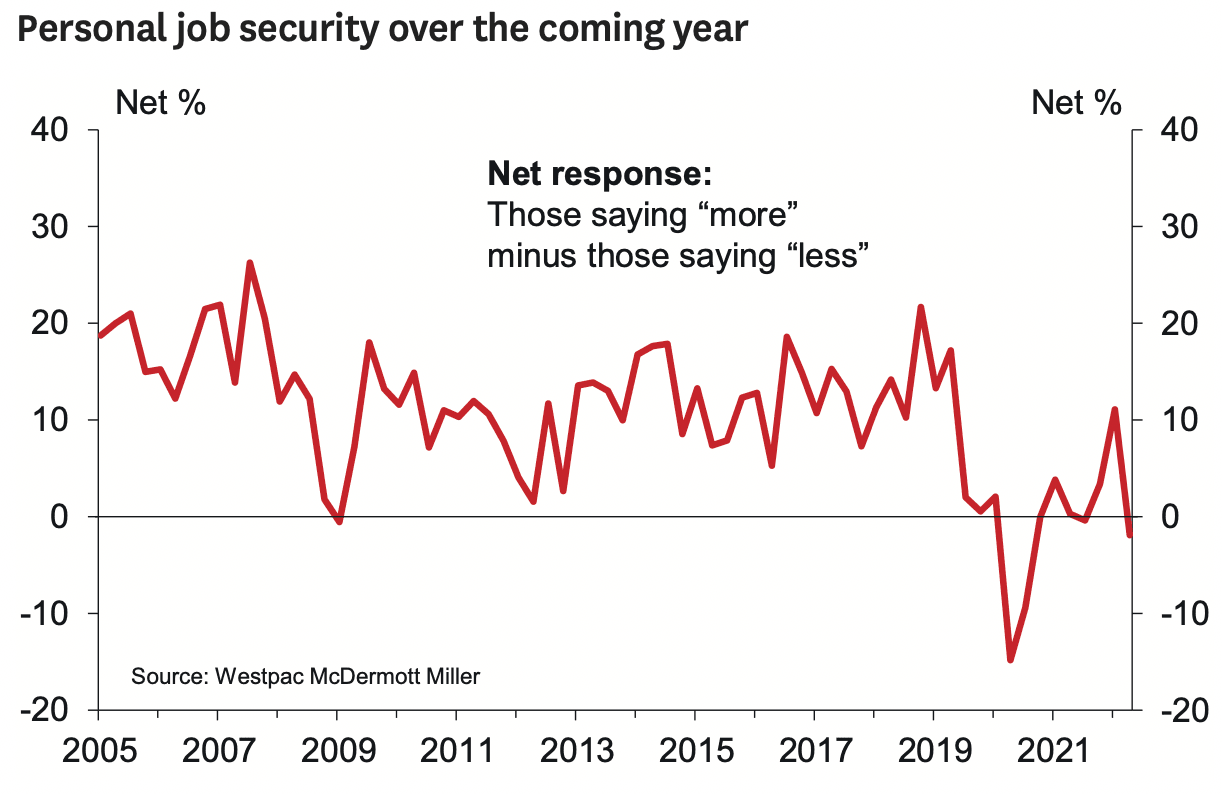 Westpac’s quarterly McDermott Miller Employment Confidence Survey reported on Friday a fall in overall employee confidence, including falls in perceptions of job security and earnings prospects to near record lows, even though household incomes (as opposed to like-for-like hourly wages) are still rising faster than CPI inflation.