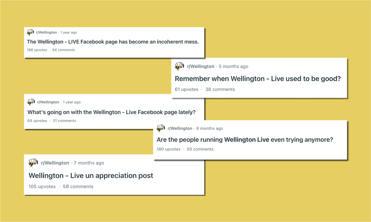 It wasn’t the only time Wellington – Live had posted questionable material, but it seemed to be happening more regularly and the Wahrlich example spurred the most emotional response. For some time, Wellingtonians had shared their concerns about the page on other platforms. Reddit threads began popping up late last year with titles like “What’s going on with the Wellington – Live Facebook page?”, “Wellington – Live un appreciation post” and “Remember when Wellington – Live used to be good?”