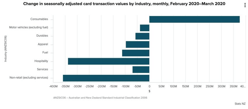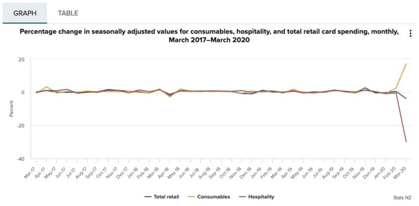 The way recessions are talked about, they sound like a crushing weight which sits on all equally, and usually they have some broad base to them. This one will be very different, and the graph, pictured below, shows how. It’s from Stats NZ, and uses bank card spending to show changes across three different areas – consumables, hospitality and total card spending – running month-to-month over the past three years. Normally the three operate in a very tight bunch, moving in lockstep, because as much as we humans like to think of ourselves as free-thinking individuals, our behaviour in the aggregate is remarkably consistent. Over the three years from March 2017 to February 2020, there are only small changes from month-to-month – a dip of around 2% in April 2018, a bump of a similar amount in November of last year.