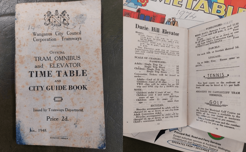 The Durie Hill Elevator used to be an integral part of Whanganui’s public transport network of buses, trams, walking and cycling. It was built by the suburb’s developer in 1919 to attract customers for his version of a garden suburb who at that point weren’t able to buy or use cars to climb the escarpment to the stunning views out over the river and the city. It worked, and by 1948 it was a key part of Whanganui’s thriving public transport system and city, as shown in this guide book and timetable linking the buses and trams to the elevator.