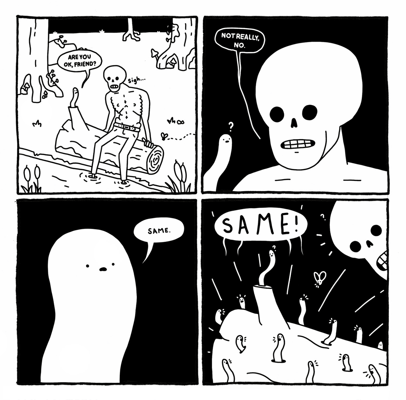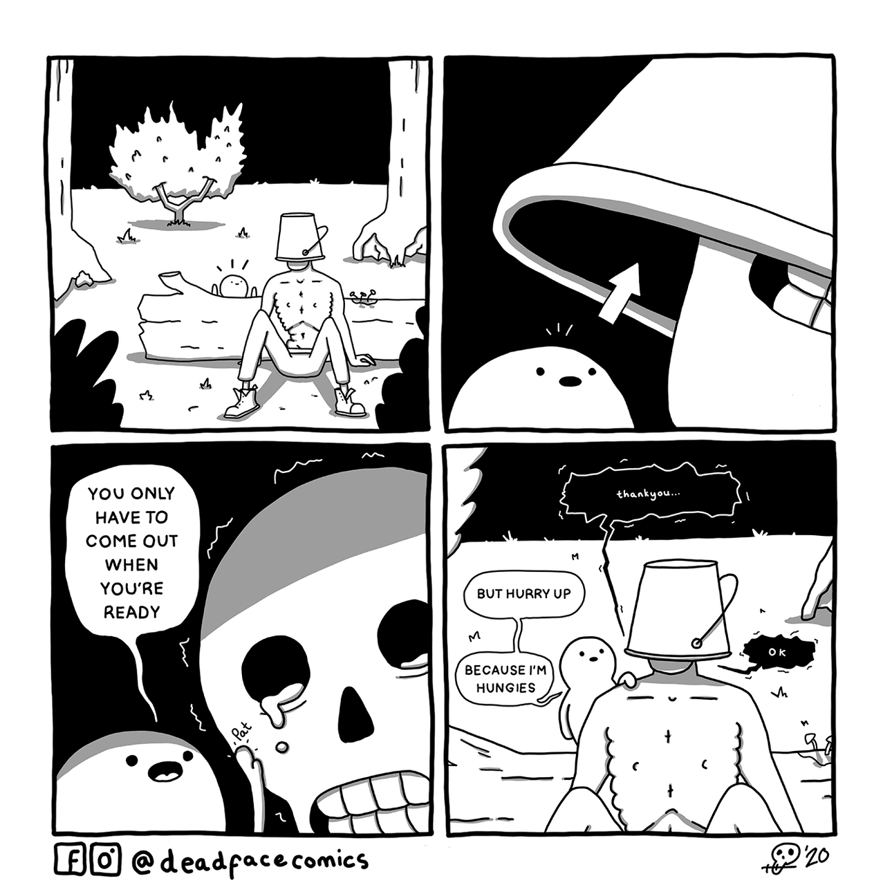 Anthony explains it best: “I started Deadface Comics back in 2016 as a way to say things that I wanted to say but didn’t really know how to say them, or rather deal with the immediate consequences of doing so. Over the years it evolved into a way for me to be completely honest and vulnerable with myself and express myself in ways that I need to but otherwise find it difficult. At the beginning I was living alone with no real support system in place and it caused me to slip into a rather deep and dark state of depression. I wasn’t well, at all, and I have always found it impossible to ask for help, to admit I’m wrong or to act when I need to. So I used the comics as a creative outlet doubled as art therapy. My fanbase kept growing and I was flooded with support and people telling me that they felt the same way as me. I had others telling me that my honesty about how I felt helped them deal with their own problems, which is one of the main reasons I have kept doing so to this day. So, yeah, I dragged myself out of the darkest parts of my depression and kept on going…with four panel Instagram comics.