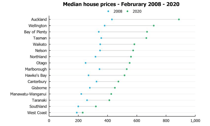 Not all regions feel these strains in the same ways, or are equally popular for prospective homeowners. While house price increases were pretty similar across the regions from 2000-2007, from 2008 onwards there is a major geographic divergence. It’s not just the cities with the biggest employment opportunities in high demand; places which are both popular with tourists and have constrained house supply, like Wanaka and Nelson, also have surging house prices.