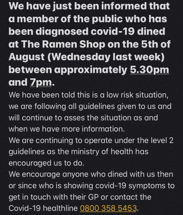 The owner of The Ramen Shop, Asher Boote, told The Spinoff he was contacted about 11.30 this morning by someone from Wellington Regional Public Health. “We thought it was best policy to let people know. We’re being open and honest, we have nothing to hide,” he said.