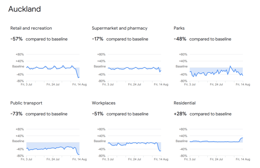 Retail and recreation traffic in Auckland is 57% down on its baseline, and parks are 48% down. Public transport, understandably, has crashed 73%, while workplaces have dropped by 51%. Supermarket and pharmacy data is just 17% down.