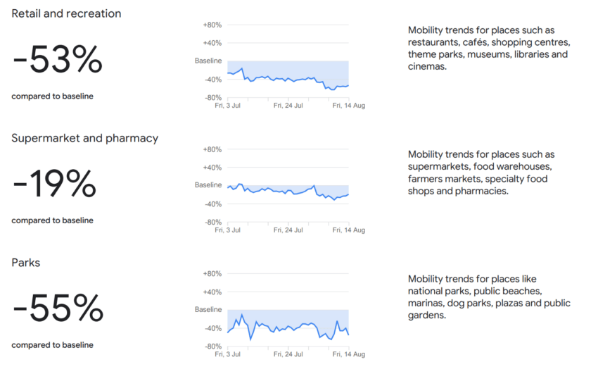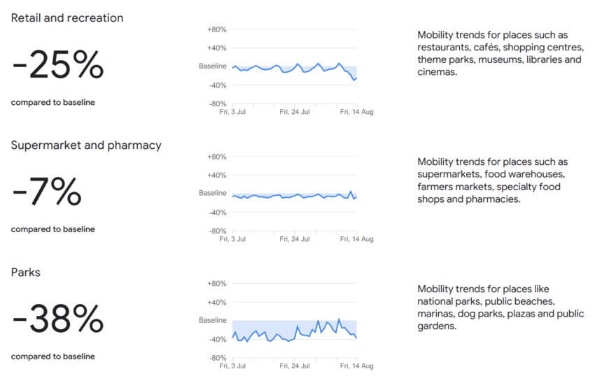 The data comes from Google’s latest community mobility report, which charts movement trends over time by geography, across different categories of places such as retail and recreation, groceries and pharmacies, parks, transit stations, workplaces and residential.