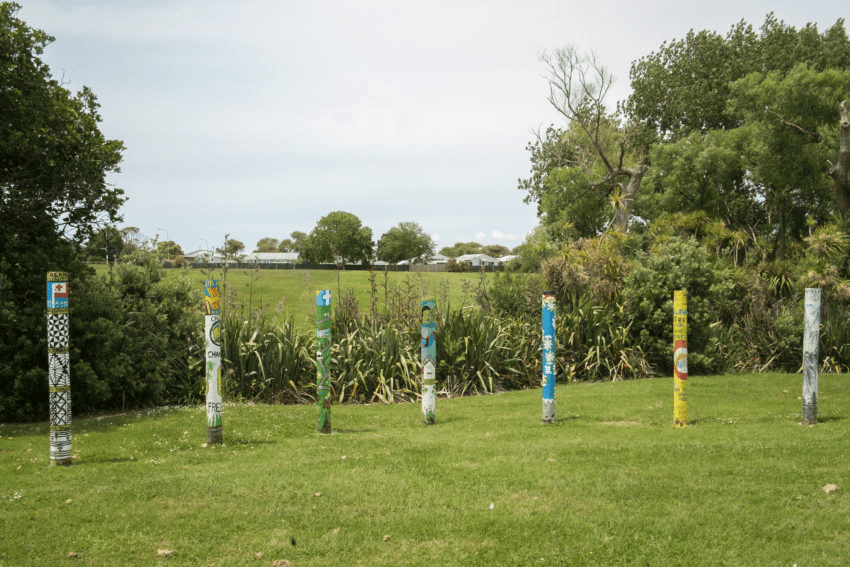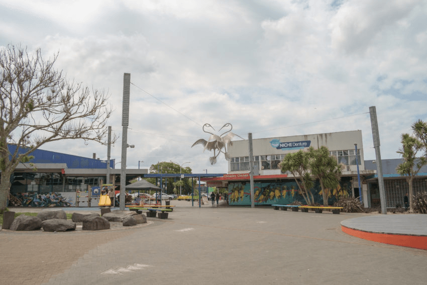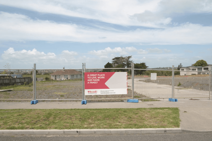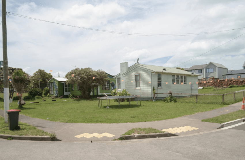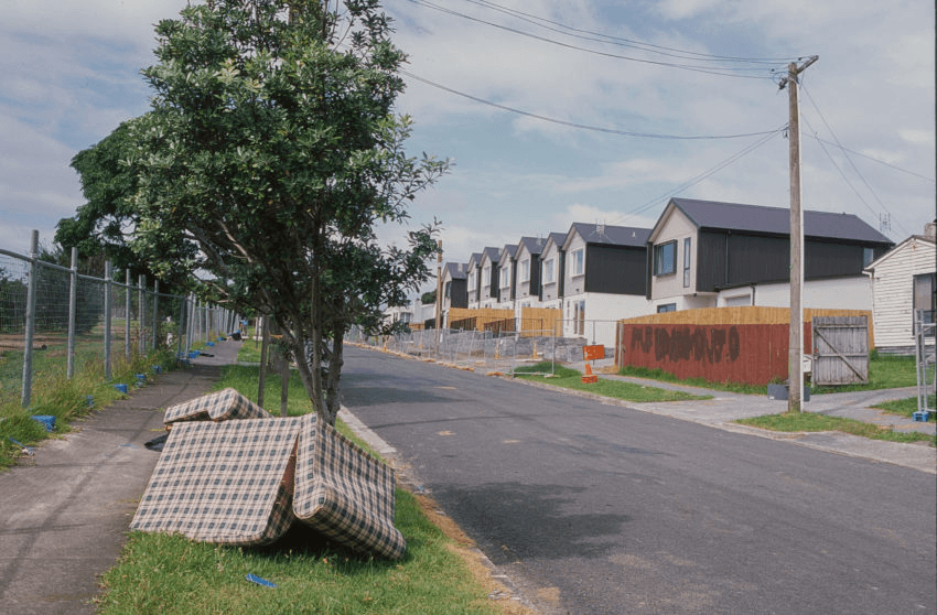 Shed remaining standing on vacant lot painted with “GI”, Fenchurch St, 2016 (All photos: Brendan Kitto)Demolition in progress, Fenchurch St, 2016Quintessential style of Glen Innes state house stands empty, Linthorpe St, 2016Early progress on new development, Sunnymead Rd, 2016Taniwha St, 2016Completed Fenchurch development, 20191.6 million dollar home for sale on Taniwha St, 2019Row of new houses on Sunnymead Rd, 2019Old house sits empty between two new houses, 2019Older style home still occupied with ready to be developed land surrounding, Kiano Pl 2019Taniwha St 2019Original houses remaining while development carries on around them, 2019Glen Innes Town Centre, 2019“Kakariki”, one of the original Apirana Ave government housing flats still in use, 2019Shared space for residents of Apirana Ave flats, 2019The road to Glen Innes, 2019Te Oro music & arts centre, 2019Entrance to Maybury Reserve, links Line Rd with Elstree Ave, 2019Totem poles painted by local community groups each depicting local scenes, Maybury Reserve, 2019Ruapotaka Marae, 2019Glen Innes library building, 2019St Pius Jesus shrine, 2019