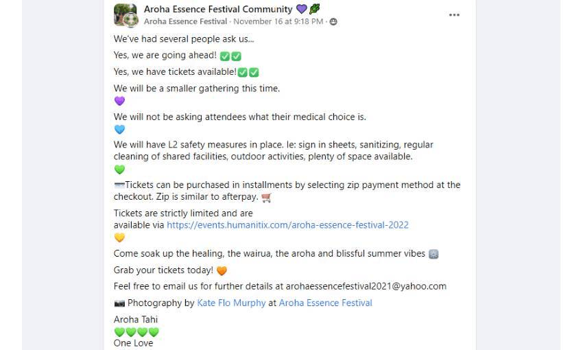 Aroha Essence Festival will be going ahead in Loburn, Canterbury, and “will not be asking attendees what their medical choice is”. However, they will have hand sanitiser and sign-in sheets available.
