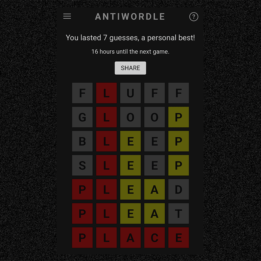 I know a few smarty pants who play (and love) this version, but even the instructions were too much mindfuckery for my pea brain. The mechanics are similar to Wordle, but the game is actively trying to avoid giving you the answer, sometimes even changing the secret word mid-play. The FAQs say “Absurdle is intended to always display the most evil possible behaviour,” which sounds promising in a masochistic sort of way, but they lost me with their need for a detailed explanation and supporting essay.