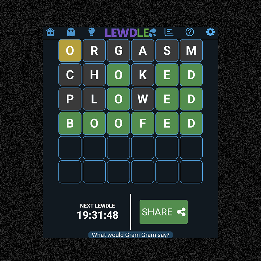 As a self-confessed dirtbag, I instantly bonded with this offshoot that I discovered Googling “sex and Worlde” after purposefully wasting a turn in vanilla Wordle guessing DILDO instead of DISCO just for the thrill of it. This “Bad Word Game” comes with its own content advisory, with guesses needing to be rude enough to be included in their “dicktionary”. While SQUIRT and SNATCH are obvious, you do have to think outside the box (pun 100% intended) to come up with solutions like BROJOB and ASSMAN.