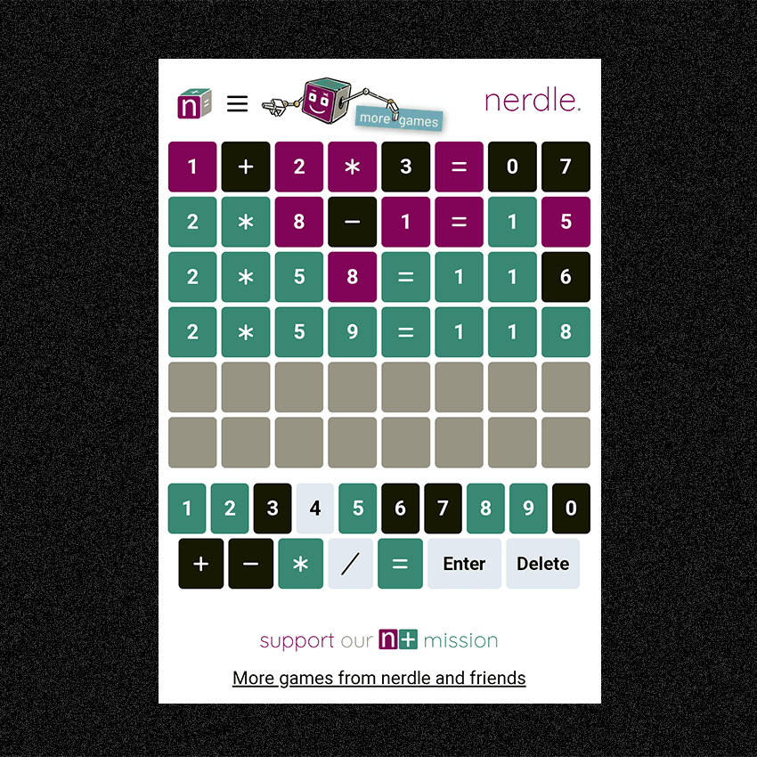 I’m going to retract my earlier “maths yuck” statement, because it turns out that relatively simple mathematics wrapped up in an intriguing puzzle is actually very fun and satisfying. Nerdle gives the player six goes to guess the eight square equation using both numbers and the basic maths symbols (+-*/=). The game sternly informed me that my first equation did not compute and to familiarise myself with the order of operations. So I resurrected my old mate BEDMAS and, armed with the arithmetic order of precedence fresh to mind, found the puzzle to be the perfect mixture of mental calculation and trial and error.
