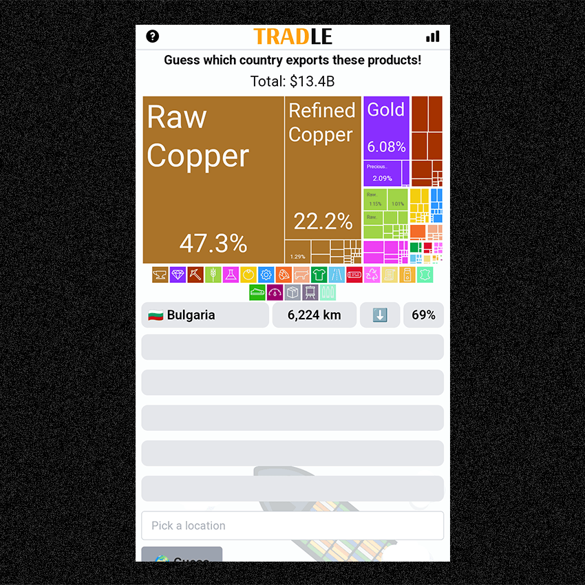 Tradle schmadle. A pretty niche and dull offshoot, where you guess the mystery country based on their exports (such as food, minerals, machinery) with clues about proximity to your guess given after each turn. It could be slightly educational if you are interested in the fact that 3.12% of Albania’s exports are non-knit men’s suits.