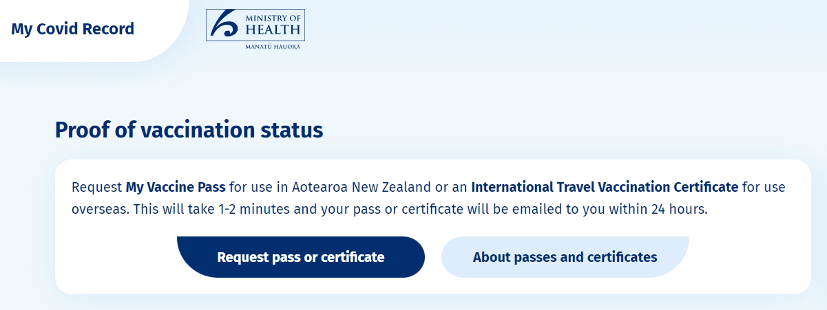 Once you’ve connected your account to your NHI data, you should see a prompt on the My Covid Record site to request your pass.