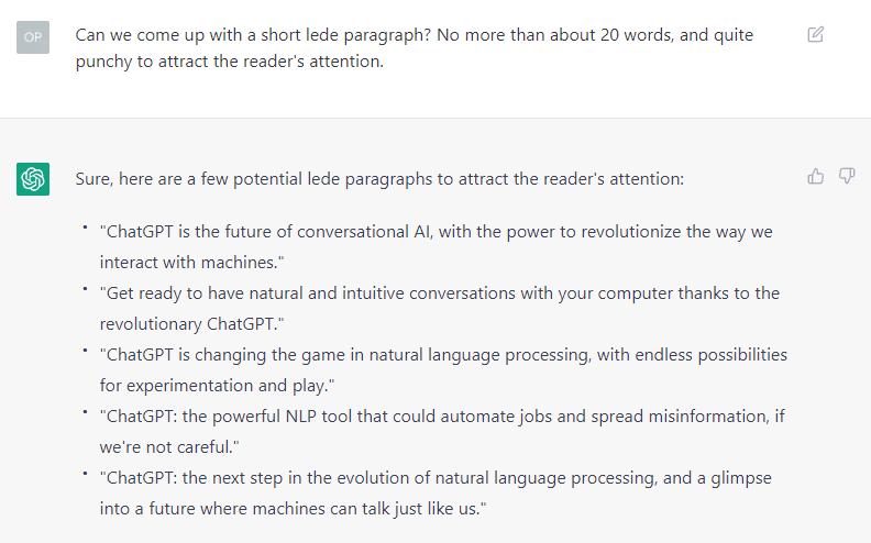 Dylan: Let’s write an article about ChatGPT. Can we start with two paragraphs that describe what ChatGPT is and why it’s an exciting development?