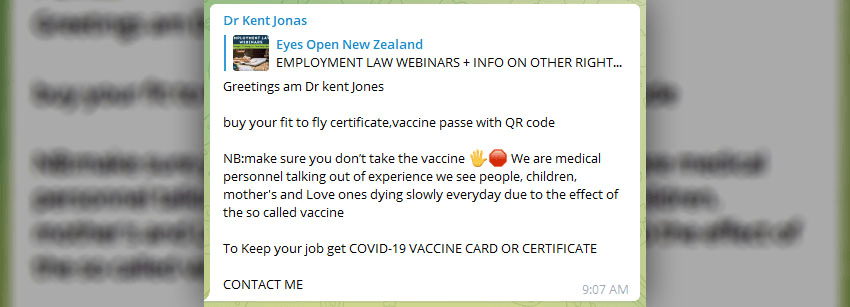 In a recent example, a user calling themselves “Dr Kent Jonas” offered to sell a “fit to fly certificate, vaccine passe [sic] with QR code” – presumably some type of official vaccine certificate. The “doctor” was sure to warn the group’s users that they definitely shouldn’t take the vaccine.