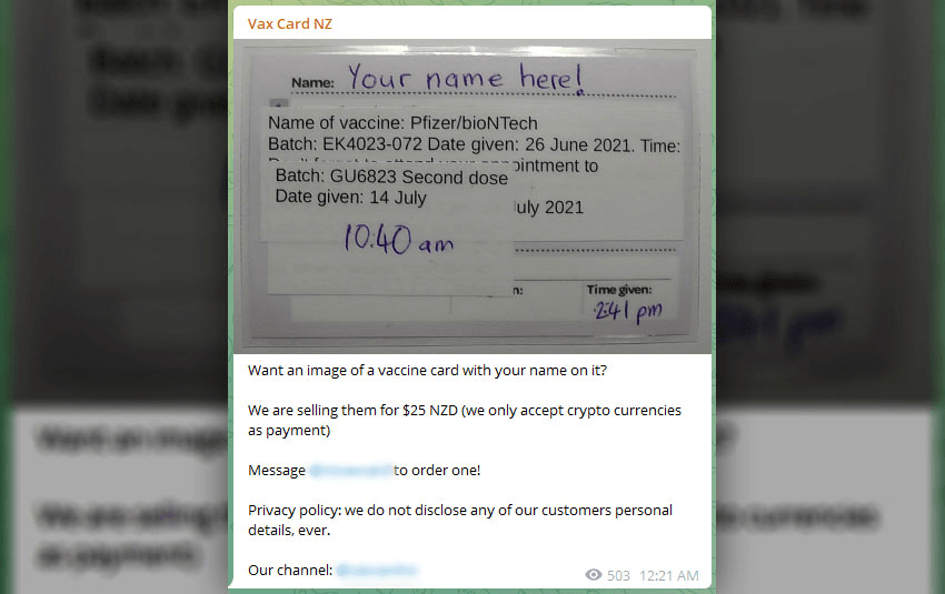 A user calling themselves “Vax Card NZ” has been marketing one such service in many local groups on Telegram, a communications platform that’s become an anti-vax hub due to its encrypted messaging and lack of censorship. Vax Card NZ promises to provide “an image of a vaccine card with your name on it” for only $25, although payment must be made via a cryptocurrency.