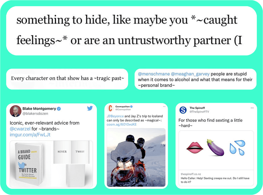 “This will do wonders for my personal brand” and “this will do wonders for my ~personal brand~” are two very different statements, for example: the former is a painfully sincere dispatch from someone who’d unselfconsciously identify as an entrepreneur or girlboss. The latter is semi-ironic, playful, mocking and self-deprecating all at the same time; a half-joke by someone who wants to use hustle culture slang, therapeutic jargon, or a term that’s very girly or New Age, but needs you to know she knows that’s cringe.