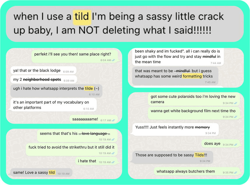 Writers for digital publications, the chronically online, social media managers, under 35s: all these groups intuitively grasp and regularly use the semi-ironic tilde. Boomers and offline normies usually don’t. But another cohort who seemingly has no clue how the tilde is actually used in the wild is perhaps more surprising: the very people who design our online communications platforms, like Whatsapp, Slack and Google Chat.
