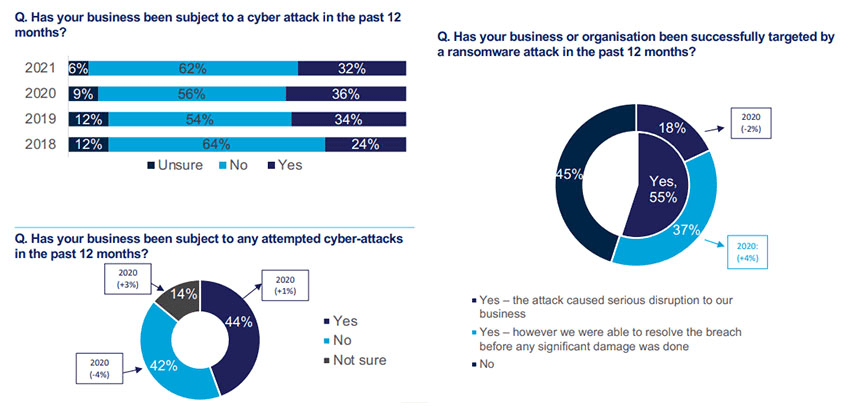 Puzzlingly, the very same report has 62% of those surveyed saying their business had not “been subject to a cyber attack in the past 12 months”, and only 44% reporting that they’d been subject to an attempted cyber attack – responses that seem distinctly at odds with the 55% who reported a successful ransomware attack.