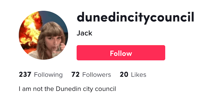 Vibes: Call the cyber-police, it appears a civilian simply named “Jack” has commandeered the @dunedincitycouncil handle, with the bio simply reading “I am not the Dunedin city council”. Given the profile photo is Taylor Swift in front of an exploding car, it is safe to assume that the Jack in question is Jack Antonoff. Groundbreaking, subversive, guerilla. Classic TikTok.