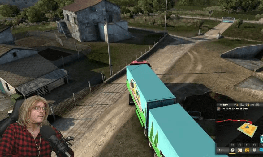 On the other hand Tom Walker, an Australian comedian, has worked hard to complicate his truck driving. He has more than eight and a half thousand followers on his Twitch channel, where he live streams his American Truck Simulator sessions. He started streaming when the comedy circuit got shut down by the Covid-19 pandemic. “I needed something to do and a job, probably in that order,” he told The Spinoff. “I started truck streaming because it was low impact enough that I could just natter on to the chat.”