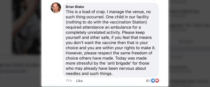The parent described to me, in a direct message conversation, the immediate support from on-site vaccination staff and said that their child recovered quickly with no other effects. They were not directed to hospital and no further care was required. It is possible that protesters outside the centre witnessed this from afar and amplified the story without context, including speculation about the seriousness and the number of children involved.