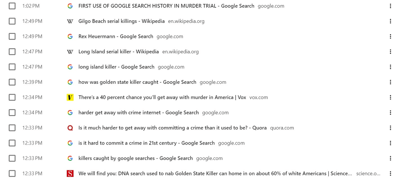 Usually, I’d be loath to publish anything that could give potential murderers a heads-up. But the truth is that almost nothing you do on the internet is private. At least, not in the context of a murder investigation. There is no amount of digital cleanup you can do that will fully eradicate your suspicious searches and deleted emails from being recovered by a digital forensics team. Not only is it extremely difficult to hide your online activity, anyone who doesn’t have an advanced knowledge of digital forensic techniques isn’t even going to know what to hide, beyond the basics. In order to get away with it, you would have to be smarter than the smartest person whose job it is to scour your online activity for incriminating information, which is an extremely high bar, considering most people still don’t know how to uninstall Bing from their family computers.