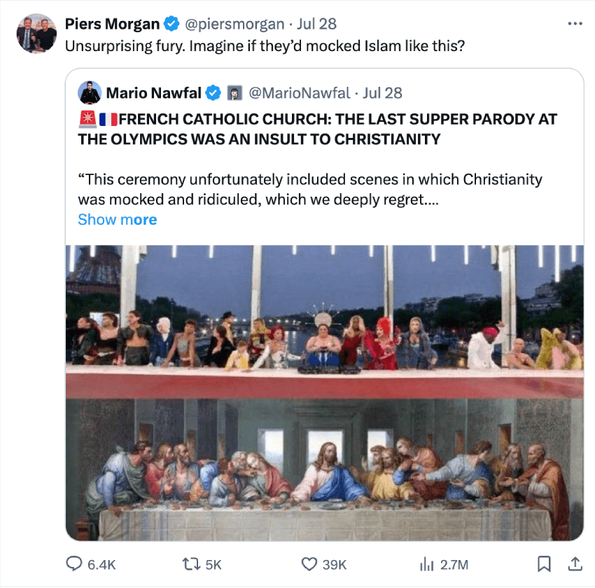 The organising committee of Paris 2024 has issued a non-apology that is nonetheless being reported as an apology, saying “Clearly there was never an intention to show disrespect to any religious group. [The opening ceremony] tried to celebrate community tolerance. We believe this ambition was achieved. If people have taken any offence we are really sorry.”