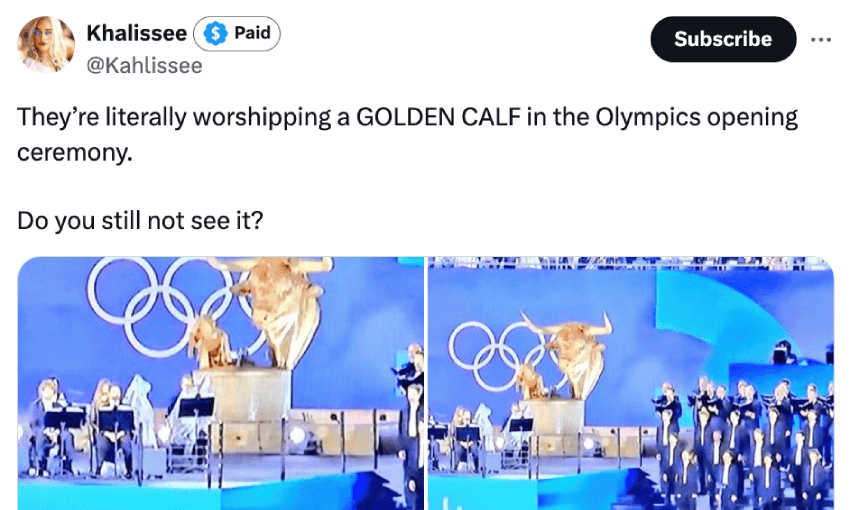 Three X users have reported seeing a golden bull at the opening ceremony. There are unconfirmed reports that it was Moloch, a pagan god or demon most commonly associated with child sacrifice and that he was smoking weed with Snoop beforehand. There is a statue of a golden bull at Palais de Chaillot in the Trocadéro area in Paris which looks a lot like the one in the pictures being shared by satan-hunters online (and might be what’s represented here) but demonic bullshit is as demonic bullshit does.