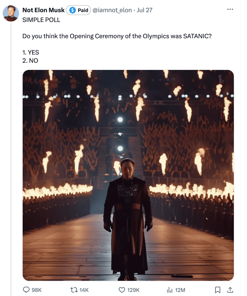 The results of a scientific poll conducted by a parody account on X called “Not Elon Musk” revealed that tens of thousands of adults, some of whom presumably have jobs and responsibilities that involve sorting fact from fiction (and some bots, who we mustn’t assume aren’t also busy and important) think that yes, it was massively “satanic”.
