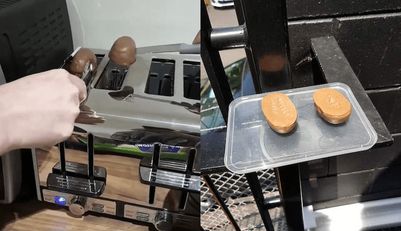 Aesthetically, this was the least pleasing of our eggsperiments, possibly because it was our first attempt and we were a little overzealous. One egg half was held with tongs and the other one had a knife jabbed into one end to create a handle. This affected the integrity of the shape, which, combined with the heat of the toaster, led to a bit of a smooshing situation that resulted in, as Alex Casey put it, a “chaos egg”.